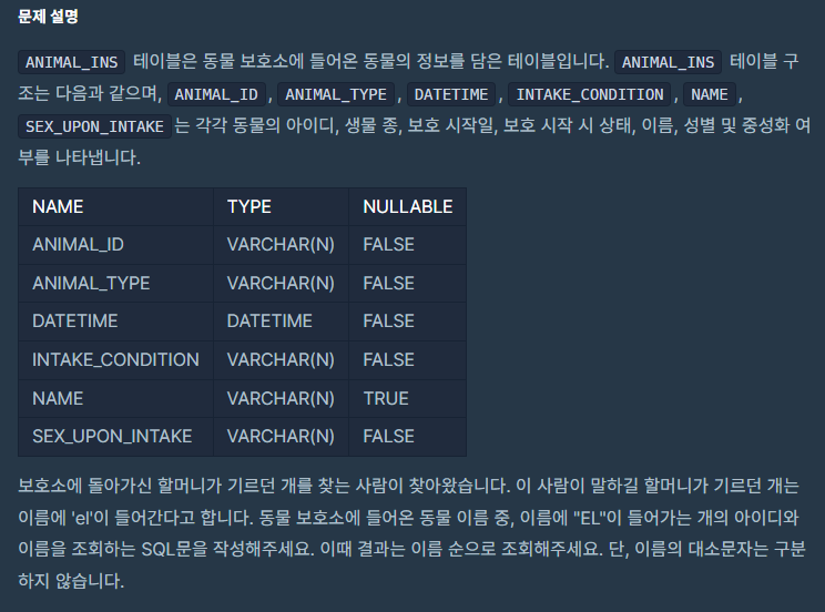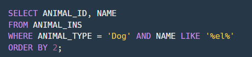 두 가지 조건을 연결해서 생각해야한다. 동물 TYPE이 개일 것. 이름에 el이 들어갈 것.