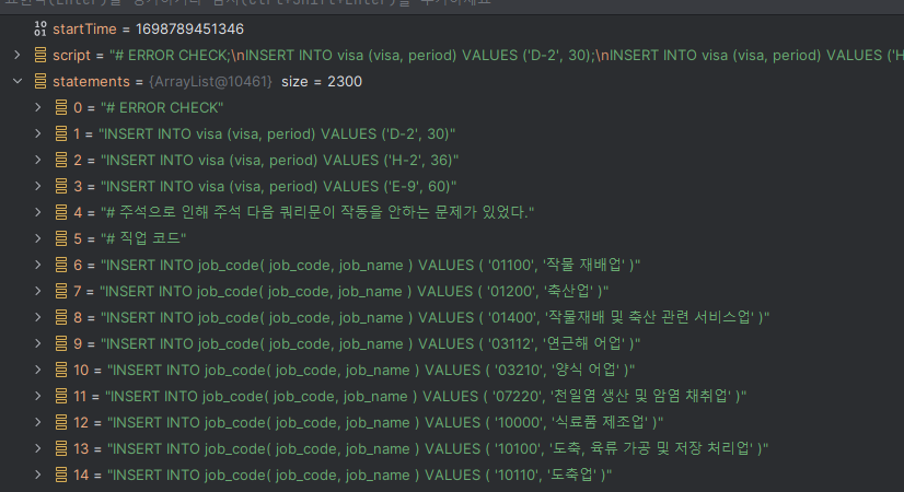 스텝을 빠르게 넘기니 sb에 글자가 하나씩 담기더니 statement에 실행될 스크립트가 담겨져 실행되었다. 첫 주석의 #(수많은 하이픈은 어디 갔지?)과 두번째 주석을 넘기고 첫 쿼리문이 같이 들어가서 실행되는 것이 보인다! 즉 주석과 바로 아래의 쿼리문이 하나의 스크립트로 실행되었기에 생긴 문제 였던 것.