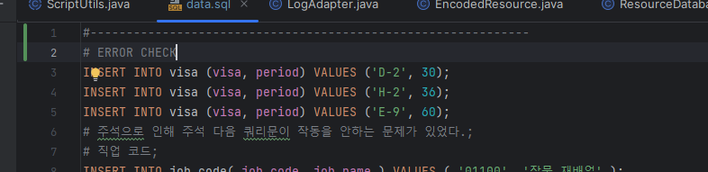 인텔리제이로 팀 프로젝트를 진행하던 때 mysql 더미 데이터를 만들어 init.sql.mode로 실행할 때 삽입하는 작업을 진행하고 있었다.